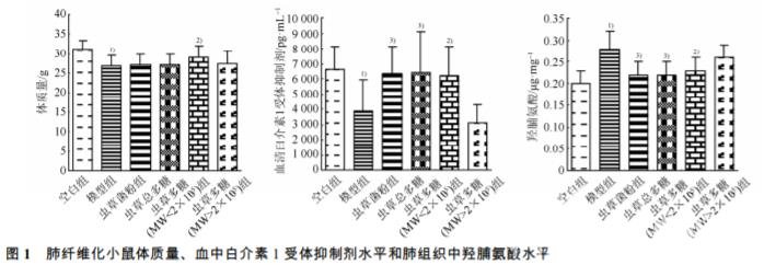 與空白組相比,造模后的小鼠體質(zhì)量顯著降 低,小鼠肺纖維化模型組血清中 IL-1RA 水平明顯 降低,肺組織中 Hyp 含量明顯升高(P<0.01)。與肺 纖維化模型組相比,蟲(chóng)草菌粉組、蟲(chóng)草總多糖組、 蟲(chóng)草多糖(MW<2×105 )組的血清中 IL-1RA 水平均 明顯升高(P<0.05,P<0.01),肺組織中 Hyp 的含量 均明顯降低(P<0.05,P<0.01)。結(jié)果見(jiàn)圖 1。