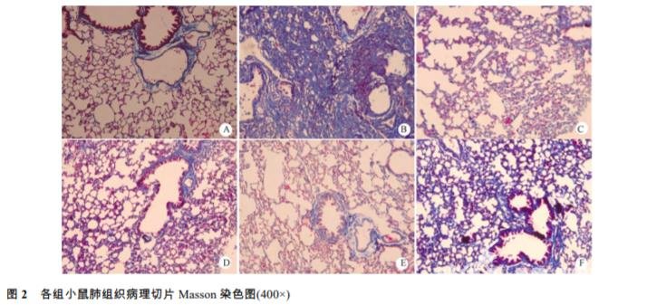 肺組織在 Bouin 液中固定 24 h 后梯度乙醇脫水,二甲苯透明,浸蠟,石蠟包埋,常規(guī)切片,行Masson 染色,觀察膠原沉 積,使用 Motic Med 6.0 數(shù)碼醫(yī)學(xué)圖像分析系統(tǒng)檢 測(cè)肺纖維化面積。