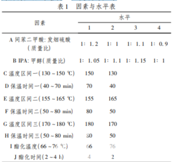 運(yùn)用正交設(shè)計,將 w( SO3 ) = 65% 的發(fā)煙硫酸 一次性加入三口瓶,攪拌狀態(tài)下加入間苯二甲酸用 量的 20% ~ 30% ,在 20 ~ 30 min 內(nèi)將物料溫度提高 到 115 ~ 125 ℃,再將剩余的間苯二甲酸全部加入三 口瓶,并加入少量的無水硫酸鈉。然后分以下三個溫度區(qū)間進(jìn)行: 將物料溫度升高至 130 ~ 150 ℃ 時,加入硫酸鎘,保溫反應(yīng) 40 ~ 70 min,然后在 30 ~ 45 min 內(nèi)物料溫度升高至 160 ~ 169 ℃,先保溫反應(yīng) 20 ~ 30 min,加入 SiO2,再保溫反應(yīng) 50 ~ 80 min; 最 后在 20 ~ 50 min 內(nèi)將物料溫度升高至 170 ~ 180 ℃,先保溫反應(yīng) 30 ~ 40 min,加入硫酸汞,保溫反應(yīng) 50 ~ 80 min。反應(yīng)時加料質(zhì)量比例為間苯二甲酸∶ 發(fā)煙硫酸∶ 硫酸鎘∶ SiO2 ∶ 硫酸汞∶ 無水硫酸鈉 = 1 ∶ 0. 900 ~ 0. 891 ∶ 0. 0003 ~ 0. 001 ∶ 0. 0005 ~ 0. 0012∶ 0. 0005 ~ 0. 0015 ∶ 0. 001 ~ 0. 01。將磺化 反應(yīng)后的物料在 1. 5 ~ 2 h 內(nèi)降溫至 110℃ 以下,加 入甲醇用量的 20% ~ 30% ,待釜溫降至 85 ℃ 以下 后加入剩余的甲醇。在溫度 66 ~ 76 ℃ 酯化反應(yīng) 2 ~ 4 h,酯化反應(yīng)時甲醇的加料質(zhì)量比為間苯二甲 酸∶ 甲醇 = 1∶ 1. 05 ~ 1. 1,酯化反應(yīng)后的物料加水 溶解,水的加料質(zhì)量比為間苯二甲酸∶ 水 = 1∶ 5. 35 ~ 5. 65,降溫至 25℃ 以下,在 25 ℃ 左右加堿調(diào)節(jié) pH 值為 6. 5 ~ 7. 5,繼續(xù)攪拌 80 ~ 120 min,然后離 心脫水、溶解脫色、過濾、結(jié)晶提純和烘干,得到產(chǎn) 品。其中,離心脫水脫出的離心母液可作為酯化反 應(yīng)后的溶解劑,加料質(zhì)量比為間苯二甲酸∶ 離心母 液 = 1∶ 5. 35 ~ 5. 65。進(jìn)行差熱分析,紅外,紫外,檢 測所得產(chǎn)品的結(jié)構(gòu)。正交設(shè)計如下。
