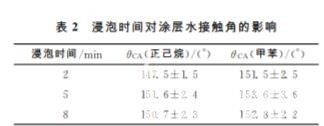 提拉前銅網(wǎng)在浸涂液中的浸泡時間同樣會影響疏水涂層的性能。因為銅網(wǎng)孔隙較小,需要足夠的 時間 才 能 使 銅 網(wǎng) 完 全 浸 潤。而若銅網(wǎng)浸泡時間過長,PDMS固化反應在溶液中大量發(fā)生,形 成 交 聯(lián) PDMS網(wǎng)絡的過程可能會影響SiO2粒子的吸附和分布,從而影響銅網(wǎng)的疏水性。因此實驗研究了浸泡時間對涂層水接觸角的影響,分別將銅網(wǎng)浸泡2,5, 8min后,以0.05mm/s的速度提拉成膜,涂層的固 化溫度為80 ℃。測得水在銅網(wǎng)涂層表面的接觸角 見表 2。 可 見,無 論 采 用 正 己 烷 還 是 甲 苯,浸 泡 5min得到的疏水銅網(wǎng)的水接觸角最高。因此選擇5min為最佳浸泡時間。