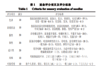 參照SB/T 10139—1993《饅頭用小麥粉》主要評價 指標對面條的顏色、表觀狀態(tài)、咀嚼性、彈性等7 個評分項目進行評價,滿分為100 分。挑選10 個愛吃面條且具 有一定專業(yè)知識的人員組成感官評定小組,對添加不同比 例的LOX面條進行感官評定,最后將小組評定結(jié)果的平均 分作為最終得分。面條評分項目及評分標準如表1所示。