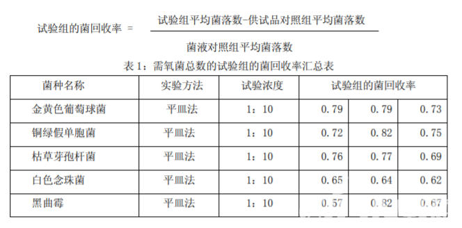 取上述制備好的 1:10 供試液 9.9ml 5 支,分別加入金黃色葡萄球菌,銅綠假單胞菌, 枯草芽孢桿菌,白色念珠菌和黑曲霉 0.1ml(含菌量約為 103~104 cfu/ml),混勻。分別取 1ml 注入無菌平皿中,傾注胰酪大豆胨瓊脂培養(yǎng)基,混勻,倒置培養(yǎng)。按平皿傾注法測定其菌落 數(shù),同法測定供試品對照組及菌液對照組菌數(shù)。