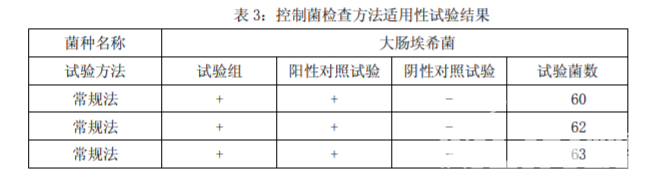 適用性試驗,霉菌和酵母菌總數(shù)計數(shù)方法適用性試驗和控制 菌檢查方法適用性試驗,分別要進(jìn)行三次試驗。結(jié)果見表 3。