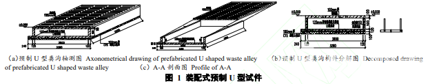 本文試驗(yàn)設(shè)計(jì)并制作了 2 組裝配式預(yù)制結(jié)構(gòu)體系共 10 個(gè),包括 U 型裝配式預(yù)制構(gòu)件和 V 型裝 配式預(yù)制構(gòu)件兩種形式的等比例試件,每結(jié)構(gòu)體系均由 3 個(gè)預(yù)制構(gòu)件現(xiàn)場(chǎng)拼裝完成。 其中 U 型試件尺寸如圖 1 所示。外形平面尺寸為 3.0 m×3.28 m,高 0.62 m,A-A 橫截面積為 0.51 m2,體積為 1.54 m3,單個(gè)構(gòu)件凈重 3.93 t。表面做掃毛處理,以提高預(yù)制構(gòu)件與滿足使用工藝要求 的金剛砂面層之間的粘結(jié)能力。