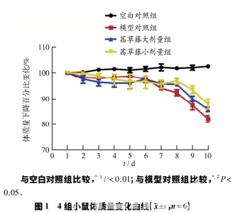 將 24 只 C57BL /6J 小鼠采用體質(zhì)量 分層隨機(jī)數(shù)字表法分為空白對照組,模型對照組,茜草 藤大、小劑量組,每組 6 只。