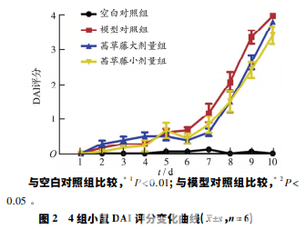 茜草藤對 DSS 誘導(dǎo)的 UC 小鼠的 體質(zhì)量影響見圖 1。空白對照組小鼠在實驗期間體質(zhì) 量均上升,一般狀態(tài)良好。小鼠飲用含 3%DSS 飲用水 后,3 組小鼠體質(zhì)量均不同程度下降。實驗第 7 天,與 正常對照組比較,模型對照組體質(zhì)量明顯減少( P < 0.01) ,模型對照組在實驗第 7 ~ 10 天體質(zhì)量均下降, 且第 9 和第 10 天下降最明顯。茜草藤大、小劑量組體 質(zhì)量均較模型對照組偏高,第 8 天,與模型對照組比較 差異有統(tǒng)計學(xué)意義( 均 P<0.05) 。