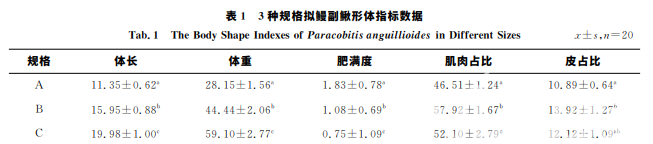 3種規格擬鰻副鰍形體指標測定結果見表1.隨著質量規格的增大,肥滿度呈下降趨勢.此外,肌肉及皮 占體質量比例呈現先增后緩趨勢.綜合可知,B規格泥鰍的肌肉占比為最高.